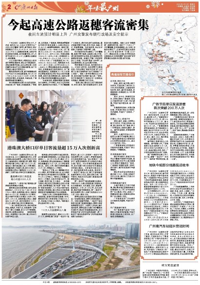 广州日报讯 (全媒体记者张丹羊、卢梦谦 通讯员交宣、交通宣)记者昨日从广州市公安交警部门获悉,春节期间,预计假期最后三日(2月2日至4日,即大年初五至大年初七)返穗客流密集,且较多司机选择夜间赶路,夜间流量明显上升;元宵节后首日(2月13日)大量群众返穗返工,客流骤增。