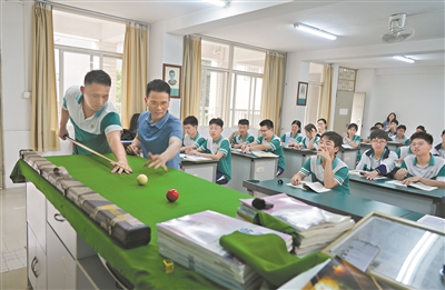 当佛山三中高二8班的同学们走进物理实验室,他们都被特别布置过的讲台吸引了:绿色桌布上放着红球和白球,两摞书在一侧堆出了“球袋”,一根长长的球杆随意放置着。