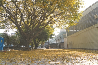 即将拆除的场馆旁,遍地是金黄的落叶。