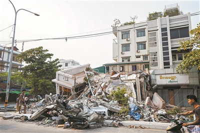 3月30日,救援人员在缅甸曼德勒天空别墅开展救援行动。