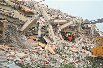 救援队及志愿者进入垮塌的建筑。