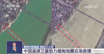 画面中显示的是高分四号卫星、资源一号02D卫星拍摄的灾后卫星影像,可以看出地震对当地建筑造成了破坏。