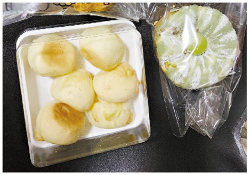 21时45分,记者来到门店,向店员出示提取码,店员从货架上提取属于记者的盲盒。记者现场打开盲盒,看到里面一共有四个不同种类的面包和糕点,分别是抹茶红豆意式雪芙、岩烧牛角、莓果蛋挞、现烤麻薯,门店零售价格分别是13.9元、9.9元、15.9元、15.9元,总价值在55.6元。
