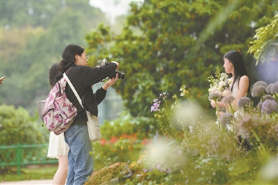 游客兴致勃勃地和花卉合影。