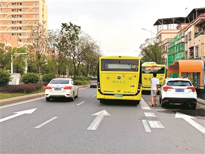 更令人瞠目的是,在北往南方向的仙村中学公交车站,有机动车在路边占道违停,令公交车无法靠站和停放。公交车只得停在道路中间的第二条车道上。三条机动车道,被挤占得只剩下一条,车流通行效率大受影响。途经的车辆只能减速,从唯一一条车道“见缝插针”般穿过。