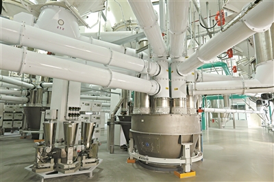 记者探营时发现,这座智能面粉厂外观呈米白色,由多个圆柱体组成。智能工厂共有9层,从低至高分别是密集库,控制系统处理中心,空压机房,配电房,中控室、磨粉机、参观通道,色选机、检验室,清粉机、去石机,高分筛、去石机,清理筛、杀虫机,新风系统等。从小麦到面粉的生产环节包括:进粮、初清、储存,清理、润麦,研磨,清粉和筛理,面粉储存和配粉,打包等环节。