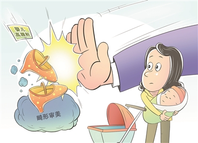 近日,在社交平台上,有人晒出部分电商在售卖一款“婴儿高跟鞋”的商品,还有配文写着“1岁宝宝人生第一双高跟鞋……”由于该鞋子形似“三寸金莲”,“引起强烈不适”,被不少网友怒斥审美畸形。尽管商铺客服辩称“用作装饰,不是真鞋”,却难以打消网友的质疑。近年来,儿童穿戴成人化问题频引争议,从“奶辣风”到“婴儿高跟鞋”,到底迎合了谁的审美、谁的需要?这值得好好反思。凌驾儿童权益之上的成人审美、商业逻辑,也必须及时喊停。