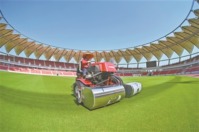 走进佛山世纪莲体育中心体育场,工作人员驾着车辆在中心的大草坪上来回游走。“我们引进了国际上比较先进的草坪品种——百慕大,这是工作人员在剪阴阳线。”佛山市体育场馆中心主任郭益均告诉记者,佛山目前就这一片百慕大草地,所以这一块草地算是佛山在此次全运会上的一大亮点。