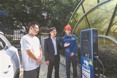 广州供电局工作人员介绍电动汽车充电桩功能。