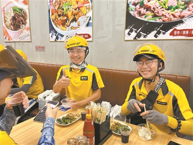 外卖骑手在暖新食堂开心用餐。图/广州日报全媒体记者邱伟荣 通讯员海宣