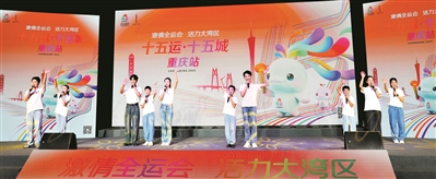 “我们带着广州的热忱与担当,在巴渝大地播撒运动火种,传递十五运的无限精彩……”活动现场,粤港澳志愿者携手重庆志愿者倾情演绎《十五运·广州见》互动节目,以青春之名发出全运会热情邀约,传递“全民全运”理念。