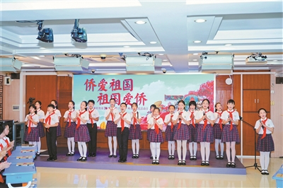 广州市华侨外国语学校学生共同演唱歌曲《我爱你中国》。