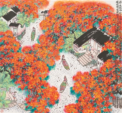 林丰俗信奉“夕阳芳草寻常物,解用都为绝妙词”的古训,其所描绘的物象如田野、山溪、山花等,往往是最朴素平常之物,然而一经他笔触,却充满生活情趣,耐人寻味。他的作品《节近端阳》描绘初夏广东水乡河岸风光,他在画中题跋谈道:“节近端阳,龙舟鼓响,凤凰花开,南国水滨屋角一片红霞,扑地腾空,璀璨夺目。此境非亲到粤地不能知也。”为了表达“一片红霞”的鲜活感受,林丰俗放下淡雅的水墨审美理念,用大片红色将广东常见的凤凰花浓墨重彩地表现出来。在构图穿插安排中,更注意水墨韵味和点线的骨干作用,这样画面不会轻浮单薄,而有南国水乡自然秀丽的意趣。