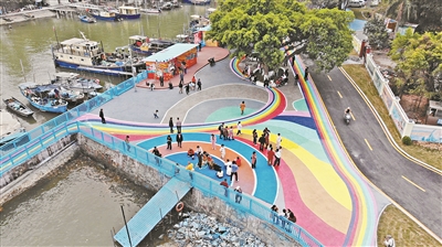 除了在硬件设施上下功夫,港湾街道还针对渔港的海洋文化“动脑筋”,用“微改造”为渔港增添梦幻色彩,带来全新的视觉景观。比如,人行步道绘制成为“彩虹路”;原有的21间渔民工具房,则翻新设计,融合舞狮、渔港人家等文化特色全面彩绘。一系列中国传统文化元素和渔港特色元素,让蒲州渔港充满“活力”和“浪漫”。居民王女士告诉记者,自己会带孩子来这里走走,“这么好看的彩绘我们都很喜欢,还能了解到渔民故事,非常有意义。”