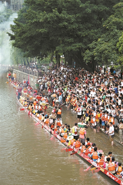 在广州猎德涌上,猎德村龙舟采青活动正在热闹上演。