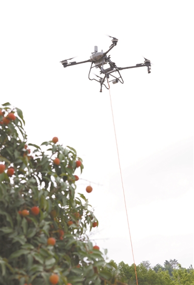 广州日报讯 (全媒体记者关家玉摄影报道)仅用5分钟!山头荔枝园刚采摘的新鲜荔枝就被无人机运送到直线距离一公里外的山下冷库保鲜。近日,在高州市平山镇仁耀垌村“智飞优果 创新未来”高州低空无人机运输荔枝首飞仪式上,三架直径约60厘米的大疆T100电动无人机吊着承载筐穿梭飞行,创下当地山区果园采摘入库效率的新纪录。