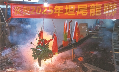 坦尾村村民放鞭炮庆祝新龙“骏水”仪式。 广州日报全媒体记者廖雪明 摄