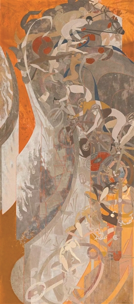 壁画作品《湾区跃章》以即将在粤港澳三地举办的十五运会为创作背景。创作者张永同表示,在“体育竞技”这一概念出现以前,各类竞争与对抗性体育活动便早已出现在古代先民的日常生活中,留存在古代石窟的壁画上。“十五运会是展现中国体育风采、传递奋进力量的重要舞台。我的作品以壁画形式再现运动健儿拼搏瞬间,诠释团结、超越的体育精神。以艺术呈现体育运动之美,共同展望体育发展的壮丽图景。”