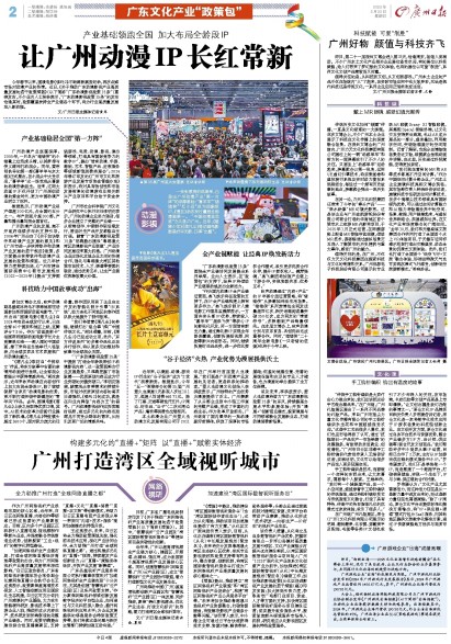 广州动漫产业的发展,离不开政府连续多年的支持引导。2006年广州出台了《关于加快软件和动漫产业发展的意见》和《广州市进一步扶持软件和动漫产业发展的若干规定》政策,多方面提出扶持软件和动漫产业发展的政策和措施。近几年扶持力度持续加码,《广州市建设国际消费中心城市发展规划(2022—2025年)》提出“支持围绕游戏、电竞、动漫、影视、演出等领域,打造具有国际竞争力的数字IP”,提出“培育动漫、手游、潮玩、艺术、智能产品、定制服务等领域新型消费类展会”;2024年修订印发的《广州市文化和旅游产业发展专项资金管理办法》则表示,将对具有独创性和市场发展前景的动漫游戏及相关新兴产业项目和平台给予资金扶持。