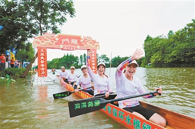 广州日报讯 (全媒体记者高敏华 通讯员丹宣摄影报道)5月24日,佛山市南海区丹灶镇第二届百村五人龙舟“拉力赛”有为水道赛区比赛(良登分站赛)在碧波荡漾的有为水道开桨。现场彩旗飘飘、锣鼓喧天,吸引了来自全镇各村居的66支龙舟队同场竞技,其中首次亮相的女子龙舟队成为全场焦点。当日下午2时,随着发令笛声响起,一艘艘龙舟如离弦之箭般冲出起点。队员们齐心协力,喊着响亮的口号,手中的船桨在水面上有节奏地划动,溅起层层白色的浪花。有为水道上,龙舟你追我赶,互不相让,现场气氛紧张而热烈。