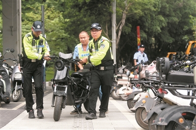 交警在处理违规“电鸡”。