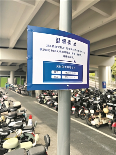 “请在规定区域内停放电动自行车,否则车辆将被依法拖移。电动自行车请规范悬挂号牌,交警部门将依法扣留无牌电动自行车。”5月26日上午10时左右,天河区黄村地铁站B出口附近停了数百辆电动自行车,现场“大声公”和无人机循环播报温馨提示。工作人员还在醒目位置放置、张贴了不少宣传告示,写明未按规定停放、影响通行的非机动车将被拖移到什么地方,同时附有相关的咨询、联系电话。