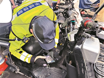 “这辆车是真的,号牌也是真的,但对应的车型和外观并不匹配。”广州市公安局交通警察支队天河大队黄警官指着一辆米黄色电动自行车说,经查,该车涉嫌套用他人号牌,交警部门对其依法进行扣车处理。在查处现场,交警部门留下《依法扣留电动自行车告知》,提示车主如发现本人车辆被扣留,可于15日内到辖区交警大队接受处理。