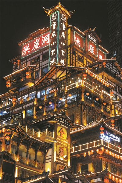重庆两江游共有8艘游轮运行,朝天门码头是两江游的起点。码头前矗立着重庆市地标建筑、高约355米的来福士商业广场,该建筑由8栋超高层塔楼、6层商业裙房构成。正值枯水期,来福士一层至长江江面有约50米的落差,在夜色笼罩下更显巍峨雄壮。如果来福士代表现代的重庆,洪崖洞则是山城的另一张名片。亮灯时分,从船上遥望依山而建的吊脚楼群,宛如置身《千与千寻》里的奇幻世界。1982年开通的长江索道,曾是重庆市民过江的“空中走廊”,如今成为游客欣赏重庆夜景的“移动观景台”,从游轮上仰望索道上的缆车,更让人亲身感受到这座“8D山城”的魔幻。沿岸的重庆大剧院建筑造型独特,与周围的江景、山景相互辉映。沿江而行,湖广会馆、南滨路、慈云寺、千厮门大桥、重庆科技馆等古今建筑,同样吸引了众多目光。