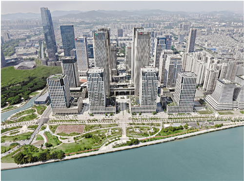 作为广州国际金融城起步区最核心的区域,金融城方城位于起步区中央,占地虽仅有0.2平方公里,却是广州金融浓度最高的地方之一。在设计上,由何镜堂院士团队操刀设计,呈“方城曲苑,翠岛玉带”的岭南特色格局。