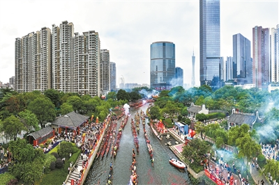 昨日上午,锣鼓喧天,一场热闹的龙船招景正在猎德涌激情上演。