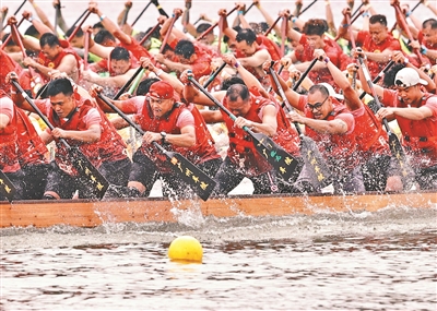 在昨日的龙舟赛上,龙舟好手奋力划桨。