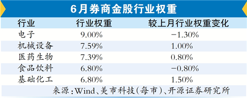 进入6月,各大券商的金股组合已陆续发布。开源证券研究所数据统计显示,全市场41家券商发布的金股,去重之后共有275只入选6月金股组合。从金股权重靠前的行业来看,电子、机械设备、医药生物、食品饮料等行业金股数量占比靠前。相比5月金股组合,汽车、国防军工的金股权重有所减少。