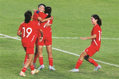 广东女足姑娘们相拥庆祝晋级决赛。广州日报全媒体记者 海国 摄
