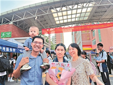 来自顺德一中的考生侯欣言走出考场时,她的父母早已手捧鲜花等候在校门外,一家人庆祝高考结束。值得一提的是,昨日是侯欣言的生日,也是她的高考结束日。她感言:“今天是一个特别的生日。高考结果很重要,但过程同样意义非凡。”