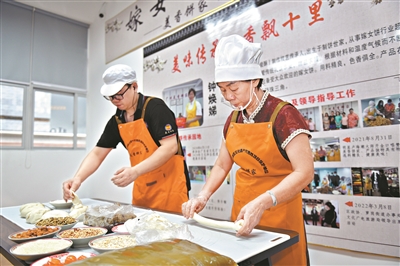嫁女饼传承人钟焕娣和徒弟在做饼。