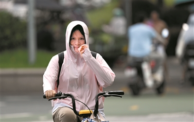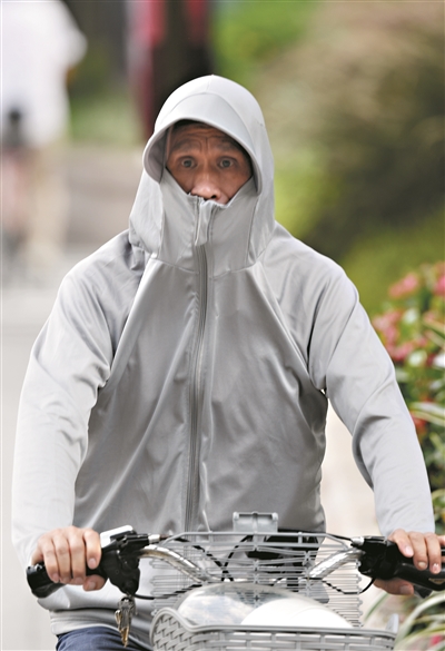高温天气,市民身披防晒服出行。
