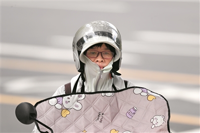 阳光强烈,骑行市民“全副武装”。