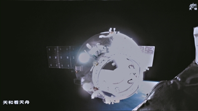天舟九号货运飞船向空间站组合体靠拢的画面。