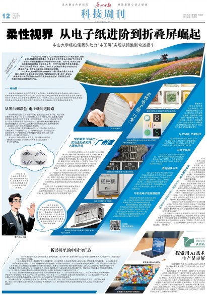 一张电子纸,阳光之下,文字仍能清晰可见;一面柔性屏,翻折之后,屏幕依旧高清显示,这是最近记者在中山大学电子与信息工程学院杨柏儒教授团队采访时看到的场景。近年来,该团队的多项重要科技成果在企业中转化为一件件生活中触手可及的商品。从华为的折叠屏手机,到TCL、京东方、奥翼电子等企业的各类高清显示产品,都有杨柏儒团队的重要科研贡献。