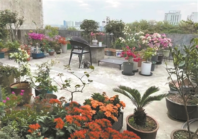花草把楼顶装饰成一个美丽的空间,给生活带来亮色。
