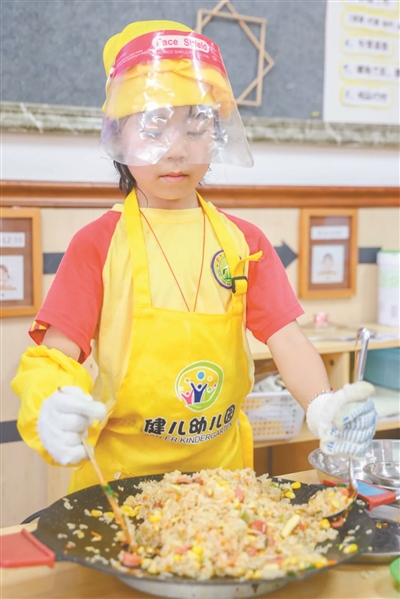 当天,在中堂健儿幼儿园大班教室里,孩子们根据自己的兴趣爱好,化身纺织工、插花师、画家还有“炊事员”,兴致勃勃地进行着各种劳动实践。记者了解到,幼儿园设有美食街、生活体验区、非遗课堂、自然生态区,通过体验式的活动激发幼儿自理能力,营造劳动光荣的氛围。