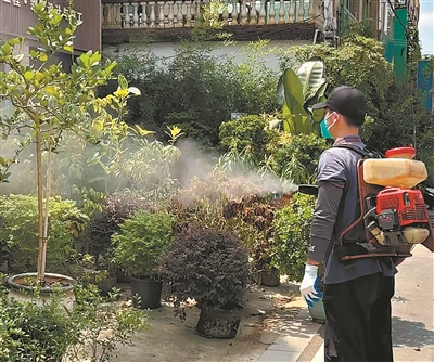 工作人员在花博园进行喷洒灭蚊。广州日报全媒体记者吴多 摄