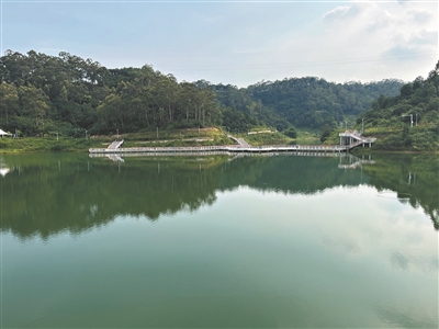 谁能想到,这片如今的生态宝地,曾因坑洼土路纵横、断头路遍布,加上周边环境杂乱,成了被遗忘的角落。2023年,塘厦镇将东莞南站山水天地项目列为“百千万工程”“1234”工作落实体系“三示范”中的示范项目之一,以大坑尾水库环境改造提升为核心,沿120亩水域铺设健身步道、亲水栈道,把水库打造成周边市民休闲锻炼的新场所、展现绿色生态发展的新平台,大幅提升了东莞南站片区的窗口形象。