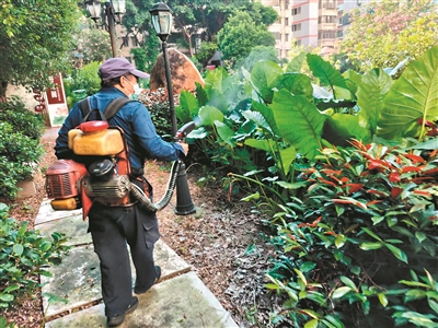 在天河区,工作人员向绿植喷洒药物。广州日报全媒体记者何钻莹 通讯员天宣摄