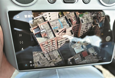 在白云区,执法人员用无人机排查楼顶积水。广州日报全媒体记者汤南 通讯员白云融媒摄