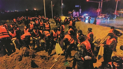 7月28日,武警北京总队千余名官兵在密云区宁村新桥构筑堤坝。新华社发