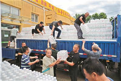 7月29日,在北京市密云区太师庄中学居民安置点,人们搬卸饮用水。新华社发