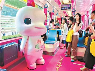 主题列车上,吉祥物引关注。广州日报全媒体记者骆昌威 摄