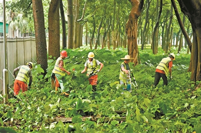 工作人员清理绿化带。广州日报全媒体记者陈枫 摄