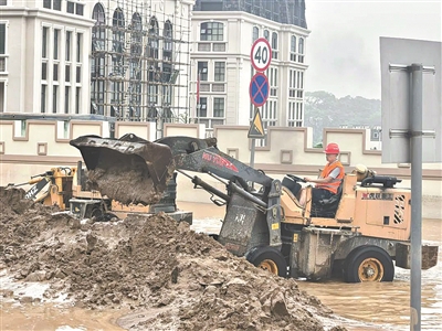 肇庆,工作人员在清理路面上的淤泥和垃圾。图/广州日报全媒体记者于敢勇